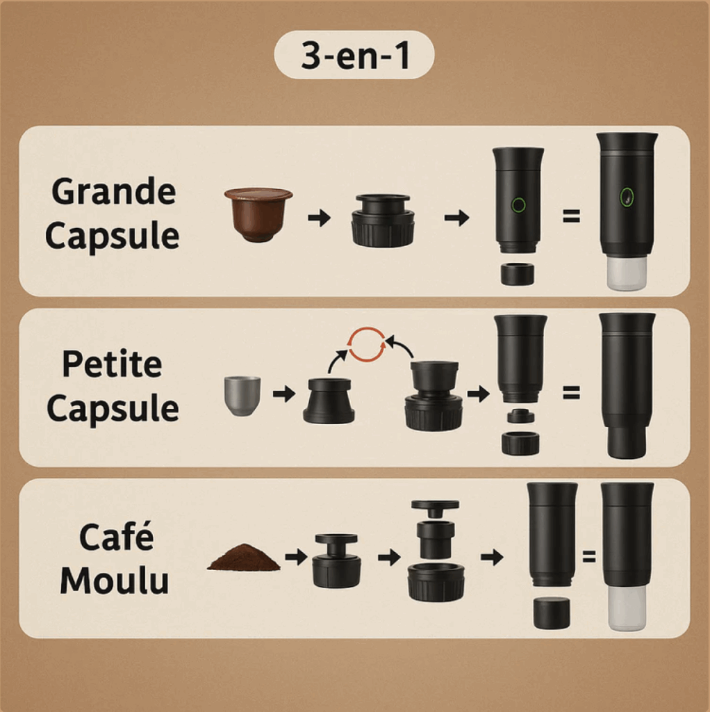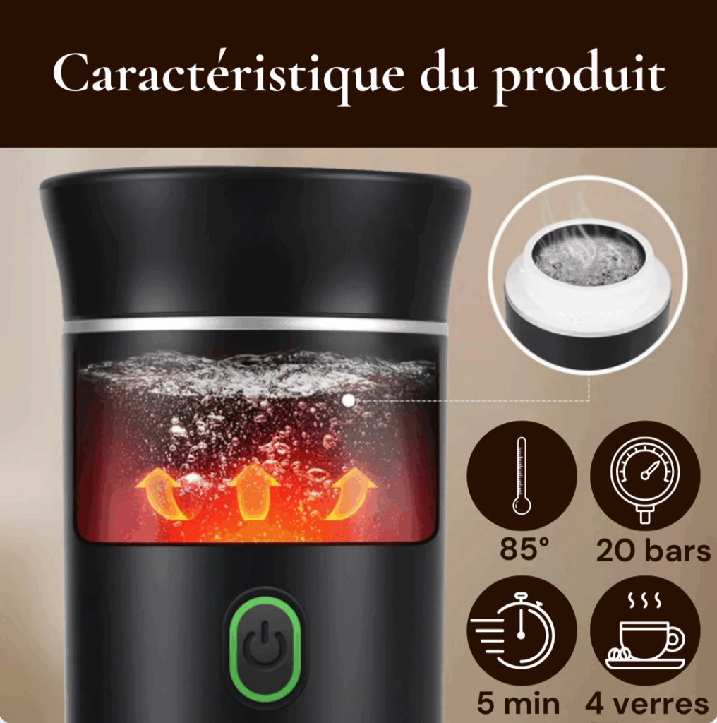 Profitez d’une machine 3 en 1: compatible avec café moulu, grandes capsules et petites capsules (Nespresso, Dolce Gusto, L’Or…). Idéale pour vos déplacements, qu’ils soient de loisir ( randonnées, pique-niques…) ou professionnels (chantier, bureaux, voiture, camion …) .